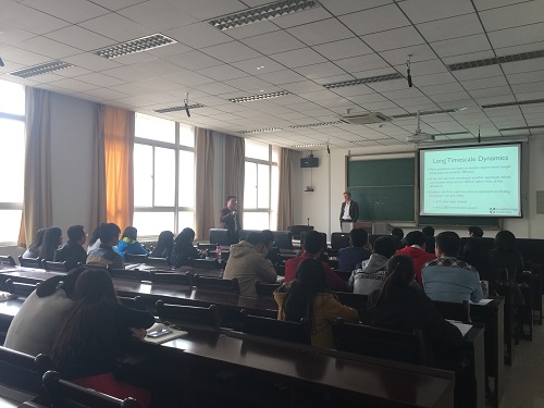 报告会之前,于淼老师为大家简单介绍了Steven Kenny教授。接着Kenny教授在他的报告中首先介绍了在材料学和物理学常用的模拟仿真方法之一分子动力学的原理。深入浅出地介绍了如何借助当今无比强大的超级计算机平台,实现含有大规模数量原子的系统的模拟仿真。其次介绍了这个方法的限制,由于原子运动的演化是不能作并行计算的,故而现如今对于大部分的系统而言使用分子动力学可模拟的时间尺度远远满足不了我们的需求。