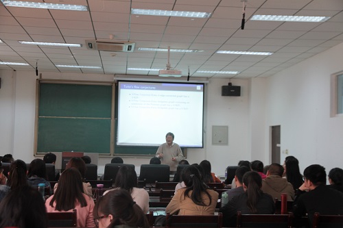 张存铨教授从地图染色问题说起,然后讲到Tutte通过引入整数流将图染色问题转换为整数流问题,从而引入了整数流问题中著名的3流、4流、5流猜想。Jaeger提出的著名的关于模定向的猜想的特殊情形即为3流,5流猜想。张存铨教授与其合作者们在之前得到了关于三流猜想的最好的结果,离3流猜想的证明只有一步之遥。他们在试图证明更加著名的Jaeger猜想的过程中,找到了该猜想的无数反例。张教授的讲课深入浅出,风格诙谐幽默、生动形象。此次报告会使与会人员收获颇丰。