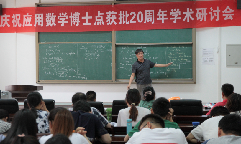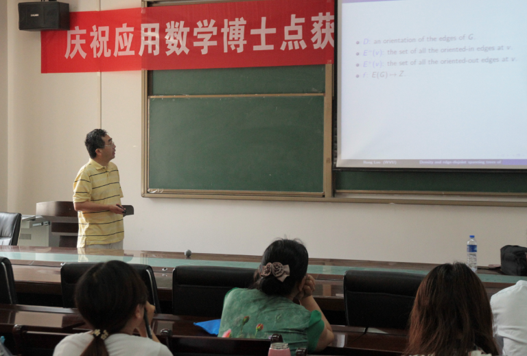 报告会开始,罗荣教授首先从Group Connectivity, Spanning Trees 和A-connected Sequences的基本概念入手,结合边染色的发展历程,逐步讲解了一些相关研究成果。虽然报告时间只有短短的一小时,但罗荣教授由浅入深,详细清晰地介绍了目前的研究现状,以及展望了未来的研究趋势。最后,罗荣教授介绍了个人的研究成果在国际上的影响及其发展前景,并与与会者分享了他学术生涯的部分体会。