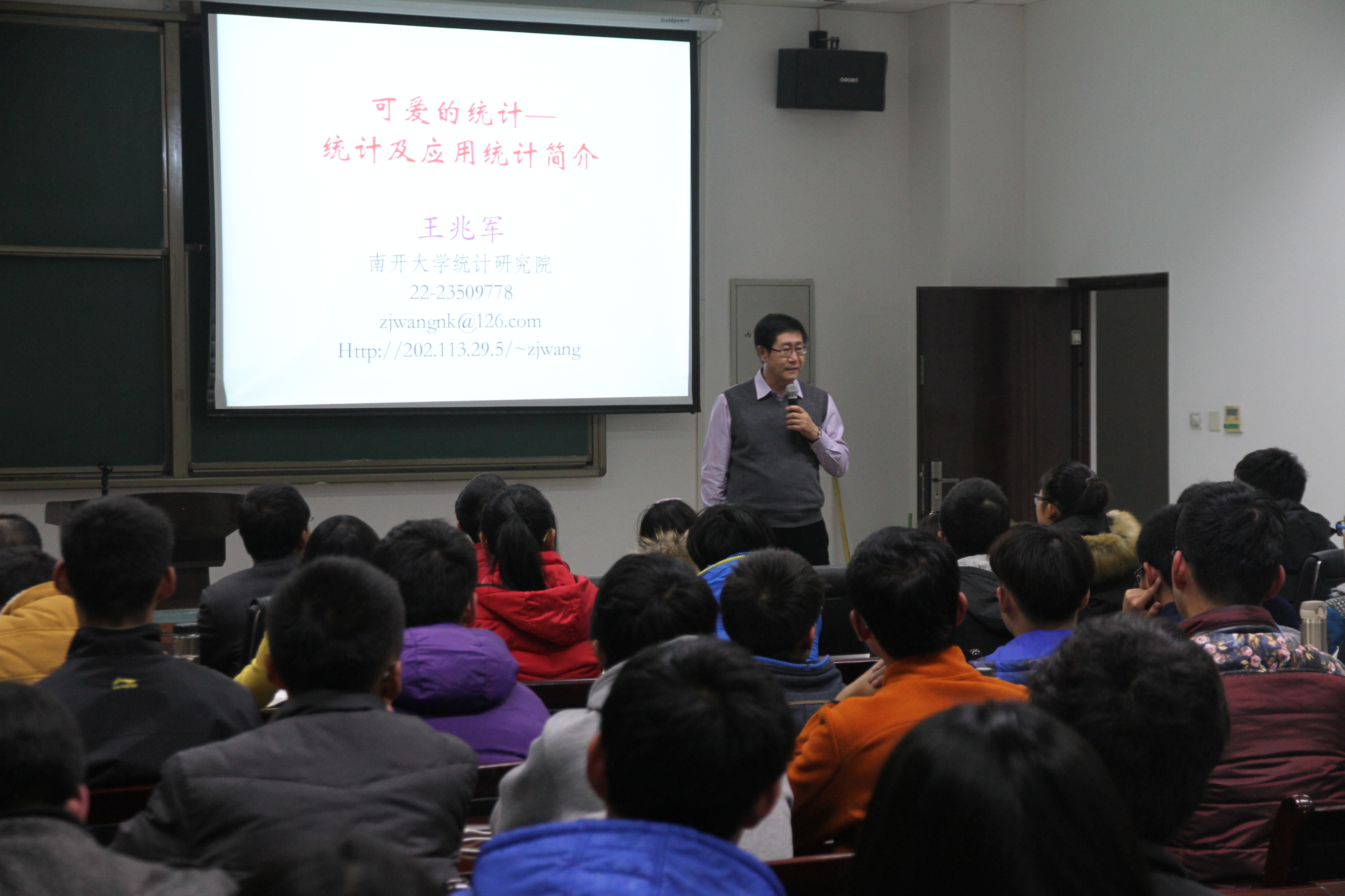 2015年12月21日晚8点,南开大学统计研究院副经理、“长江学者”特聘教授王兆军老师应邀在新校区信远楼2区206报告厅为公司师生作了题为“可爱的统计”的报告,120余名师生参会,报告会由太阳成集团tyc33455cc经理刘三阳教授主持。