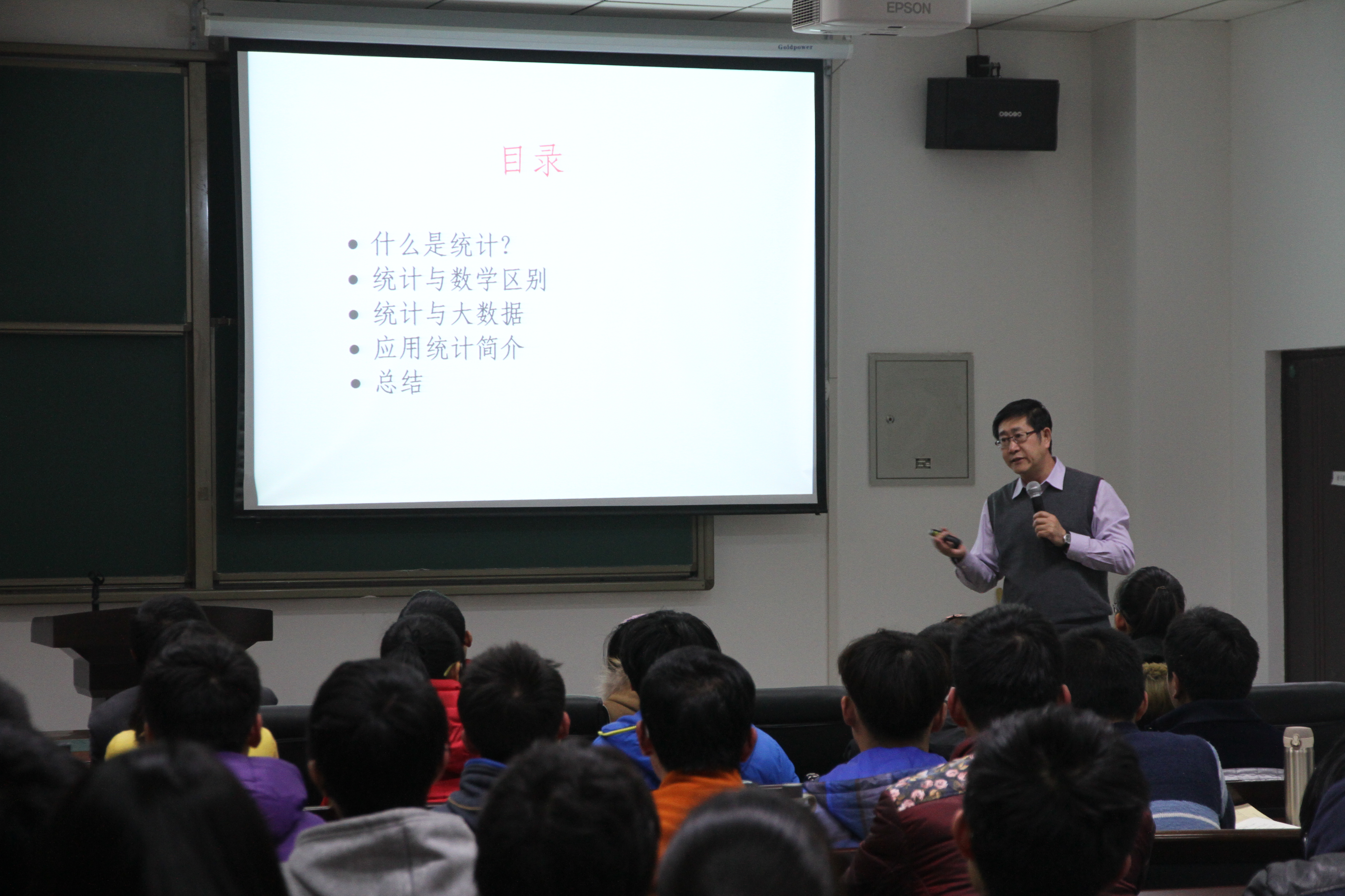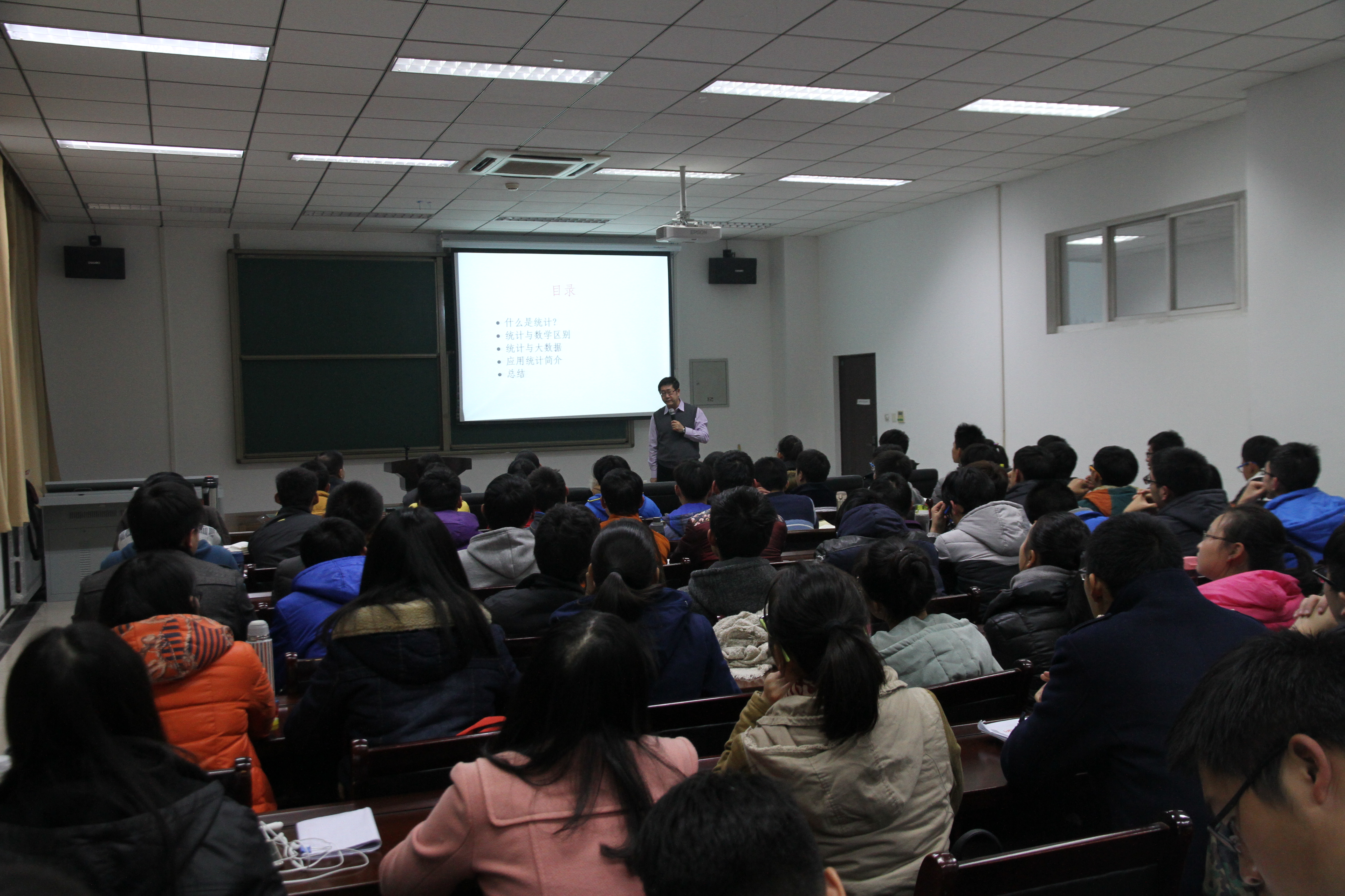 首先刘经理对王兆军教授的研究方向、学术成就等情况做了简要介绍。王教授的报告从生活中统计学的应用谈起,通过具体生动的例子,如父母身高与子女身高的关系、从女士品茶引申到统计学怎样变革了科学、民意调查等等,讲述了什么是统计、统计学的起源、统计学与数学的区别与联系、统计学与大数据、统计学的应用等方面内容,使同学们深刻认识到统计学在大数据时代发挥着巨大的作用,统计学在科技发展中扮演着不可或缺的角色。同时他激励同学们志存高远、夯实知识基础,勤于思考、刻苦学习,用自己勤奋和努力书写人生的美丽篇章。