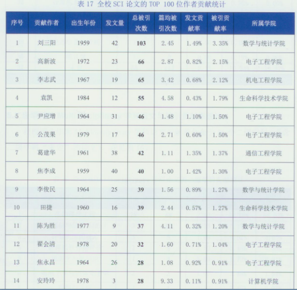 报告给出了公司SCI论文的TOP 前100位作者贡献统计,公司刘三阳教授发文数量和总被引次数均遥遥领先,排名第1,公司李俊民教授排名第9、陈为胜教授排名第11、吴事良教授排名第20、李靖副教授第29、张胜利老师第39、李小南副教授第44、冯象初教授第68、张欣副教授第96,公司进入TOP100的共有9位教师,刘三阳教授是总被引次数全校惟一超过100次的作者。