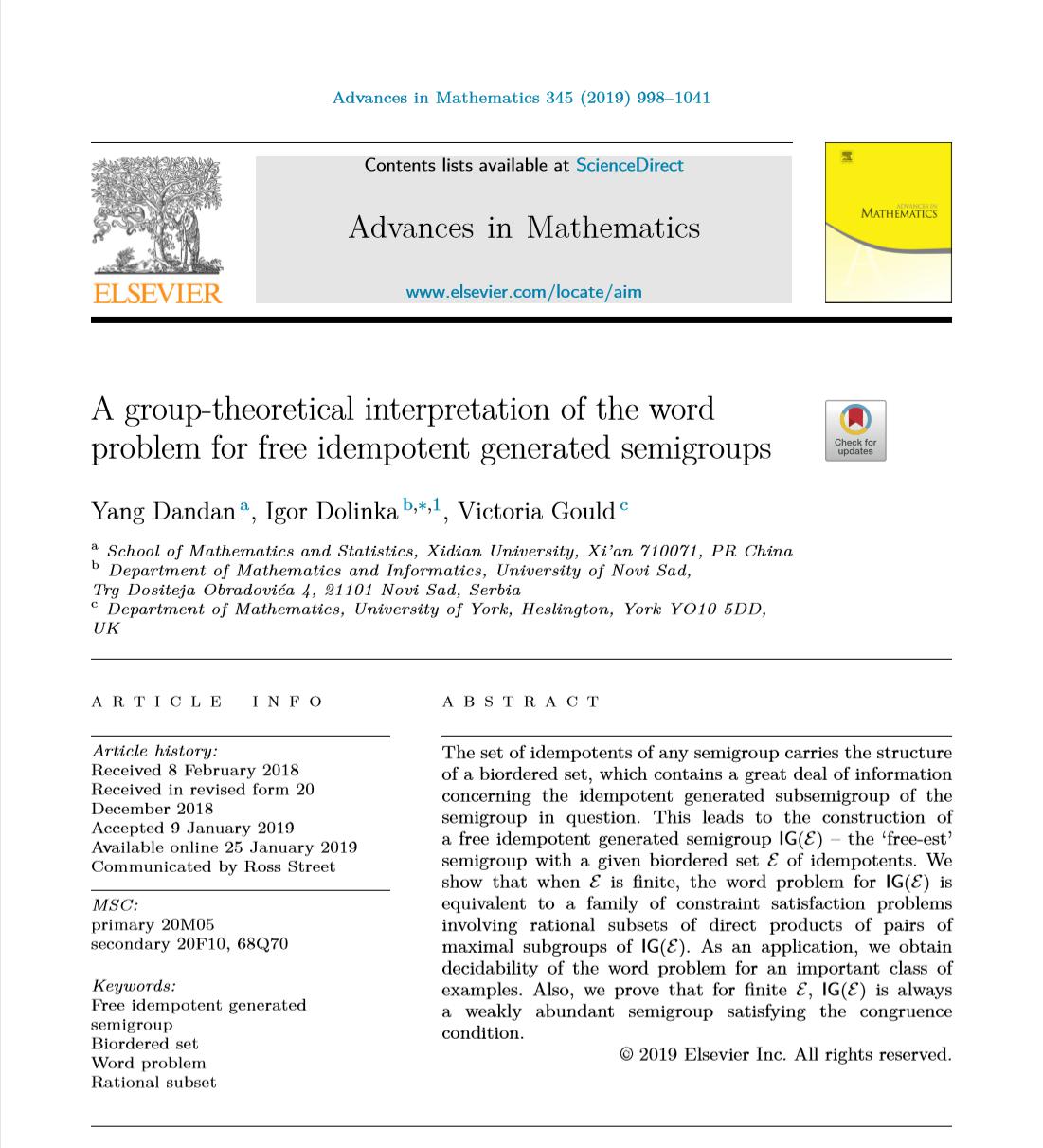 近日,太阳成集团tyc33455cc杨丹丹副教授与塞尔维亚诺维萨德大学Igor Dolinka教授和英国约克大学Victoria Gould教授合作,在国际顶级数学期刊《Advances in Mathematics》上发表了题为“A group-theoretical interpretation of the word problem for free idempotent generated semigroups”的学术论文,正式发表期卷号: Advances in Mathematics, 345, 2019, 998-1041。