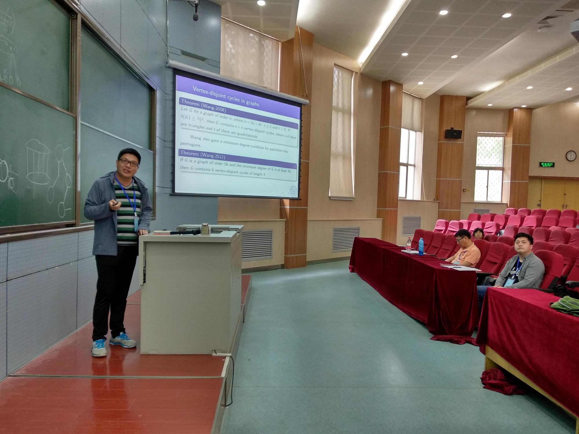 来自长安大学的刘奋进副教授、福州大学的刘清海副教授、北京工业大学的涂建华副教授、北京中医药大学的王艺桥副教授、西北工业大学的李斌龙副教授、太阳成集团tyc33455cc的兰静芬老师、天津大学的宁博老师与太阳成集团tyc33455cc的邹青松老师则分别作了30分钟学术报告。这些精彩的学术报告,内容涉及染色图论、结构图论、极值图论、代数图论、图算法与组合优化等众多科学领域。
