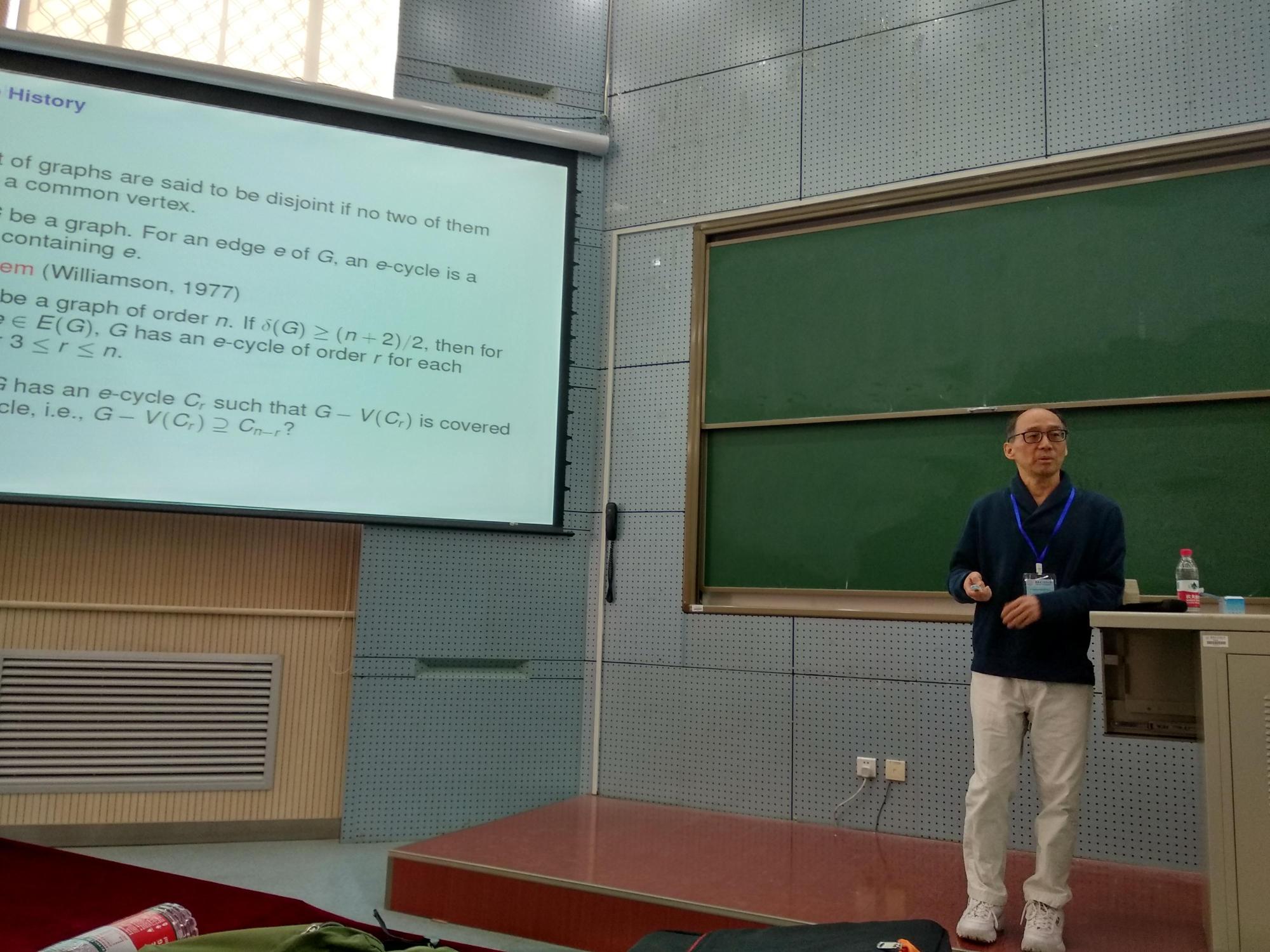 上午8点55分,本次研讨会进入学术报告环节,首先由来自美国佐治亚洲立大学的陈冠涛教授与美国爱达荷大学的汪泓教授分别作两场大会特邀报告。其中,陈冠涛教授在题为“The Goldberg-Seymour Conjecture”的报告中介绍了Goldberg-Seymour猜想的证明思路和关于该猜想的一些相关研究工作。汪泓教授在题为“Cycles with Independent Arcs”的报告中主要介绍图中不交圈的一些最新结果,然后提出一个猜想并对其加以部分证明,引发了在场同行的兴趣。