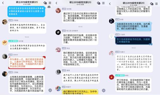 硕士2018级党支部通过个人自学分享感受的方式开展学习。支部宣传委员原杨飞同志谈及学习感想时说到:“作为一名在校研究生,一定要好好学习,认真科研,勇于创新,不辜负使命并且肩负历史使命,青年兴则国兴,青年强则国强,我们不能辜负党和国家对教育的投入,不能辜负公司对我们的精心培养。正如习近平总书记所说,一定要让青春在为祖国、为民族、为人民、为人类的不懈奋斗中绽放绚丽之花!”