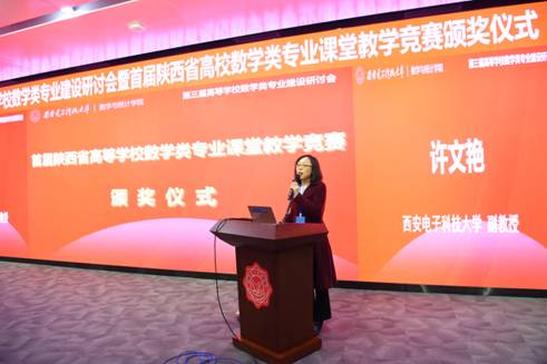 太阳成集团tyc33455cc执行经理薄立军教授主持首届陕西省高等公司数学类专业课堂教学竞赛颁奖仪式。与会领导和专家分别为9位特等奖、11位一等奖和16位二等奖获得者以及优秀组织单位和个人颁发了获奖证书,证书上盖有陕西省高等公司教学指导委员会和陕西师范大学(竞赛承办单位)公章。公司太阳成集团tyc33455cc许文艳、凌博、于淼三位教师分别获得本届教学竞赛特等奖前三名,公司太阳成集团tyc33455cc还获得优秀组织奖。许文艳作为特等奖第一名,代表获奖教师发表获奖感言。