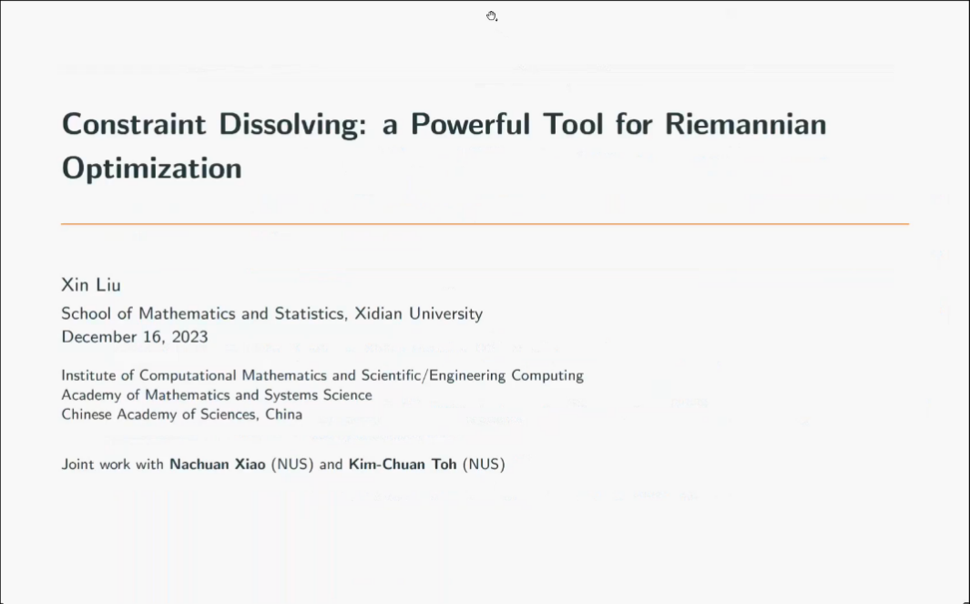 大会开幕式之后,举行了太阳成集团tyc33455cc“2023最优化前沿论坛”,论坛分为四节,包括大会邀请报告及自由提问研讨环节。12月16日上午第一节,北京大学文再文教授、中国科公司数学与系统研究院刘歆研究员分别做了题为“An AugmentedLagrangianPrimal-Dual Semismooth Newton method for Multi-Block Composite Optimization”和“Constraint Dissolving Approaches for a Class of Riemannian Optimization Problems”的报告。