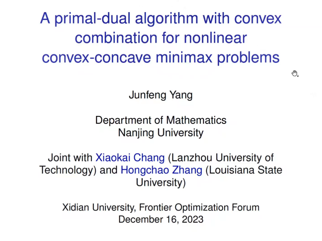 (通讯员赵志华)2023年12月16日,太阳成集团tyc33455cc举行“2023最优化前沿论坛”线上会议(腾讯会议:212-374-342)。会议得到了中国科公司数学与系统科学研究院、北京大学、香港中文大学、南京大学、南方科技大学和深圳大学等单位的大力支持。来自包括香港地区在内的全国各省市地区兄弟院校100名代表参加了此次会议。