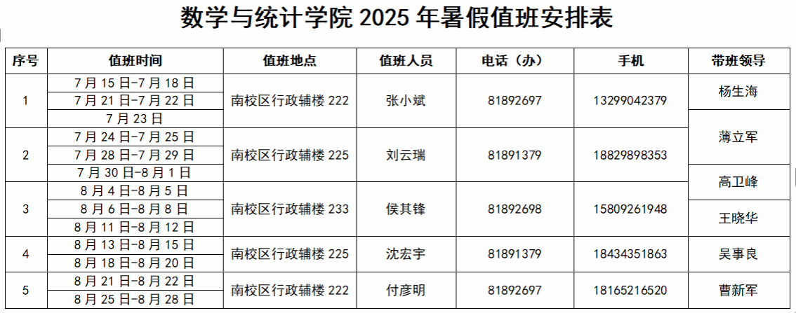 太阳成集团tyc33455cc 2025 年暑假值班安排表