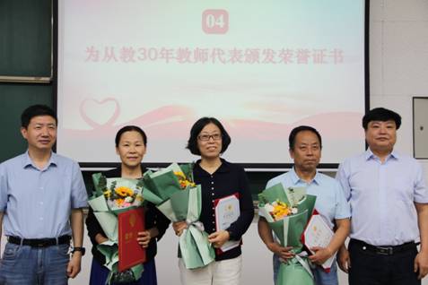 会议为近期退休的教师举行了荣休仪式,党委书记杨生海为近期荣休教师张海琴献花、佩戴围巾、颁发荣休证书。同时,为从教30年教师代表颁发荣誉证书,马华教授、冯海林教授、李俊民教授作为代表参加会议。