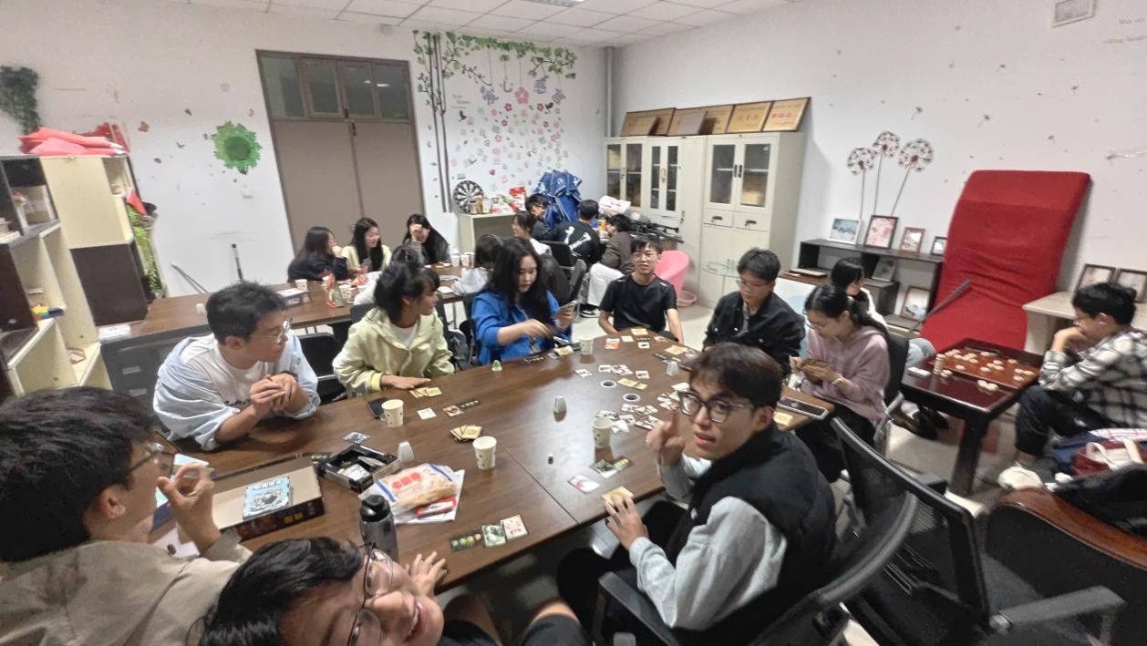 秋夜微凉,但活动现场却气氛热烈、笑语盈门。晚上六点,活动正式拉开帷幕,同学们在班委的引导下迅速融入轻松愉快的游戏氛围中。现场准备了多种类型的桌游,既有考验逻辑推理与语言表达的阵营类游戏,也有注重资源规划和策略博弈的经营类游戏,满足了不同兴趣同学的需求。