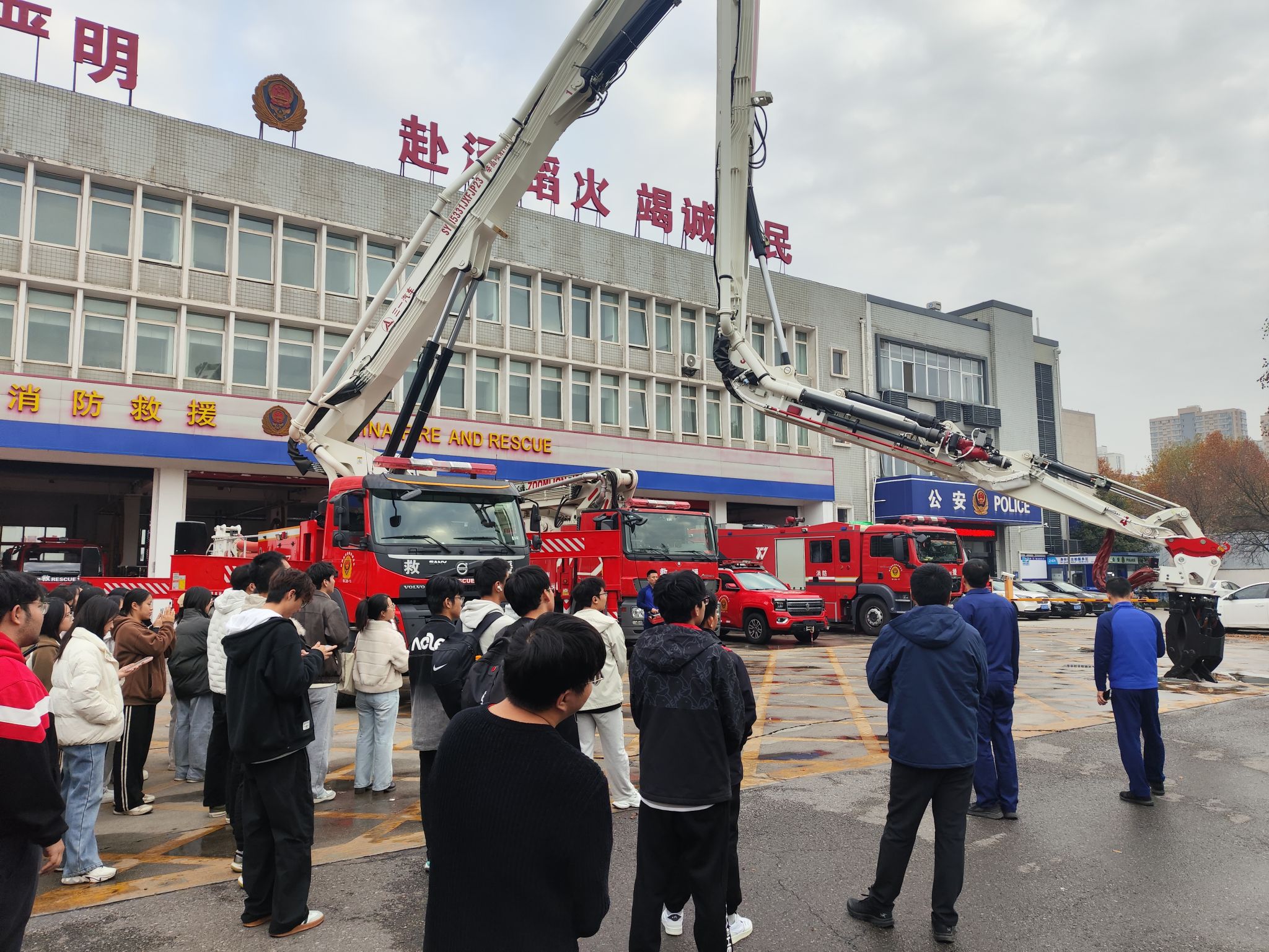 在消防车库,消防员不仅详尽介绍了各类消防车的功能特性,还对各类的消防车功能进行了演示。演示高压出水操作时,消防员特意补充:“如果宿舍发生电器火灾,千万别用水直接泼浇!应先切断电源,用干粉灭火器对准火焰根部喷射,就像我们现在演示的‘精准发力’原理一样。”生动的讲解让同学们纷纷点头记录。