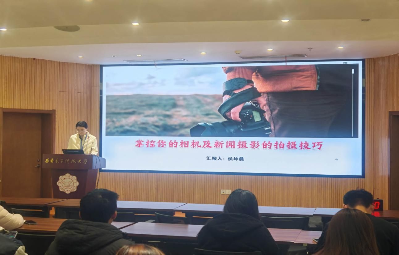 侯坤晨首先分享新闻摄影技巧,从摄影基础入手,系统讲解了构图原则、光线把握、视角选取及设备应用等关键技巧。通过“三分法”与“黄金角度”经典理论的介绍,并结合大量实际案例,侯坤晨引导同学们掌握如何通过镜头语言营造画面层次、突出表达重点,并分享了不同场景下的拍摄建议与基础后期处理方法,助力大家更生动地记录组织活动和校园生活。