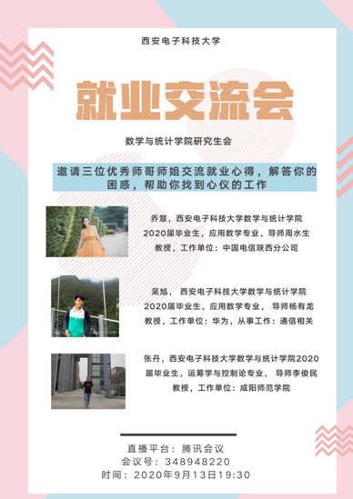 9月13日19:30,公司研究生会负责举办的就业经验交流分享会于线上开展,参加此次会议的有公司党委副书记王佩、院辅导员孙群、数统院18级究生及部分19级、20级研究生,会议吸引了超100人参与。公司邀请了三位优秀的2020届毕业研究生代表分享他们的就业经验,帮助大家解答关于就业方面的困惑。