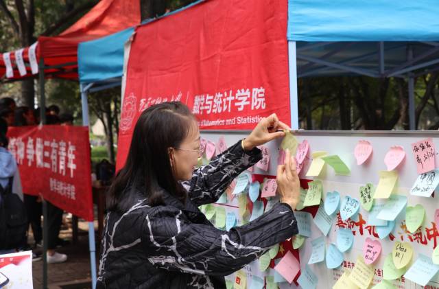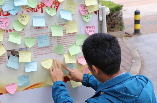 随后,每个人将在活动横幅上签下自己的名字。最后,每个人将在小纸片上写下对祖国的祝福,并将其贴在展板上面。
