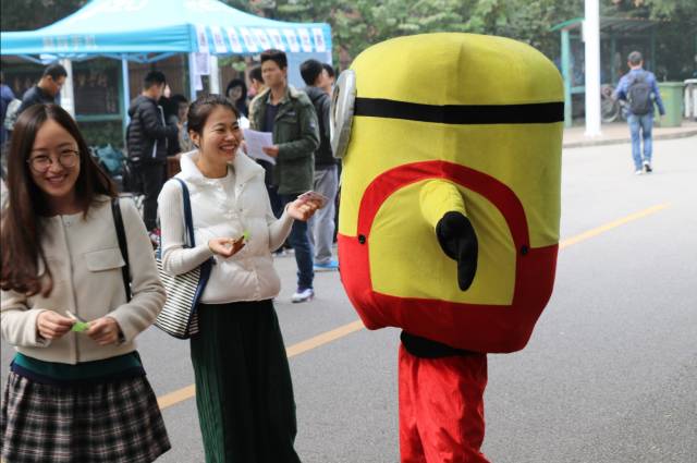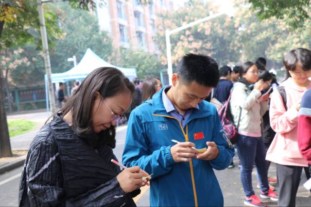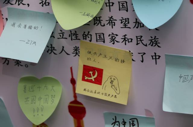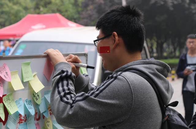 中午十二时,随着同学们陆续放学,活动现场的人也很快多了起来。每个团委员工会的工作人员的脸上都贴着一面小红旗,他们一边向过路的同学发放党的十九大的宣传单页,一边介绍我们的活动,邀请他们参与到我们的活动中来。而每个参与到活动中来的同学,都能获得一个五星红旗贴纸,将对祖国的祝福与热爱,化为贴纸,贴在笑脸上。