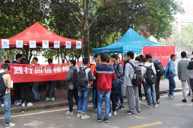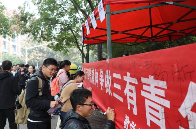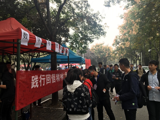 下午一时,数统院团委书记靳志伟,17级指导员赵春霞老师也来到了活动现场,与他们一同前来参加活动的还有16,17级的部分团员。大家围站在横幅前,签下自己的名字,写下对祖国的祝福,感受着党的十九大的喜庆气氛。