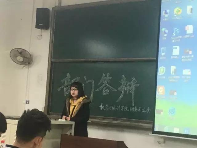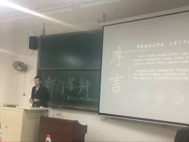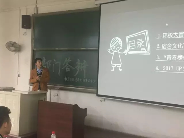 3:30分整,与会人员全部到齐。在两位主持人致开幕词后,答辩会正式开始。本次答辩会共分三个环节。第一个环节有两个阶段,即部长上台答辩和评委在答辩后为各部门评分。参与本次答辩的是团委员工会的所有部门,答辩顺序由各部长抽签产生。按照抽签顺序各部长依次上台,借助精心制作的PPT完成答辩。
