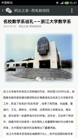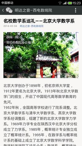 此次活动通过微信公众平台向同学们提供信息共享,同学们在课余时间可以利用手机上网进行查看,不仅使得信息传递方便快捷,更能通过了解全国名校数学系的情况,让同学们扩展自己的视野,更加热爱数学,热爱自己的专业。活动已经推出了两期了,第一期是浙江大学数学系,第二期是北京大学数学系,信息以图文并茂的方式发布,介绍了两所公司数学系的历史、发展与辉煌成就。此项活动得到了同学们的积极响应,公司将继续推出此项活动,为同学们服务。