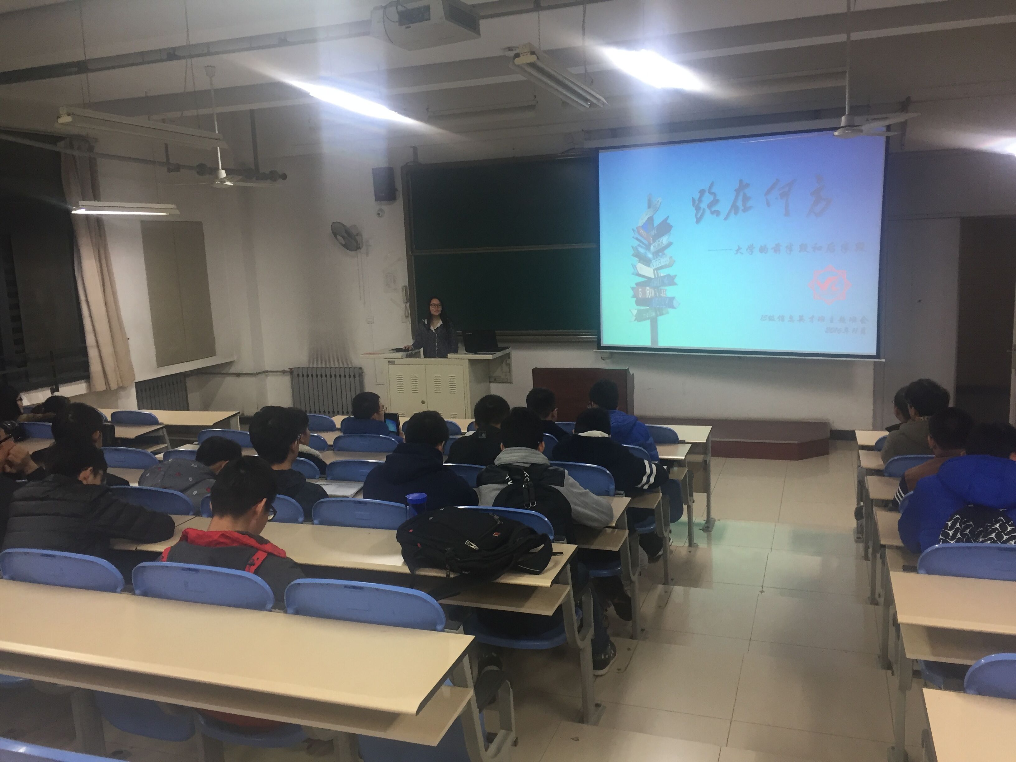 2016年11月27日2015级信息英才班“路在何方——大学的前半段和后半段”主题班会在B507教室顺利召开。 班主任宁万涛老师出席了本次班会。此次班会的召开主要目的一是对大学前半段生活的回顾二是对所剩大学时光的发展规划,让同学更好的认知自己,确立明确的目标,不虚度光阴。