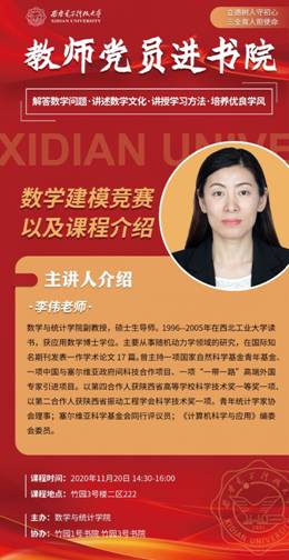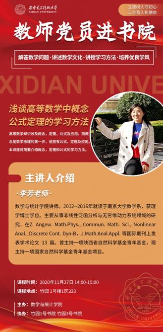 太阳成集团tyc33455cc“教师党员进书院”系列活动已连续举办四期,活动准备过程更为顺畅,活动效果愈来愈佳,众多同学受益匪浅。因此,为继续弘扬教师党员们“立德树人”的精神及发挥党员的榜样作用,太阳成集团tyc33455cc“教师党员进书院”系列活动第五期于2020年11月27日正式开始。第五期的主讲老师为教师党员李芳老师。李芳老师进驻竹园1号书院,与同学们一起浅谈高等数学中概念公式定理的学习方法。高等数学知识涉及概念,定理,公式...